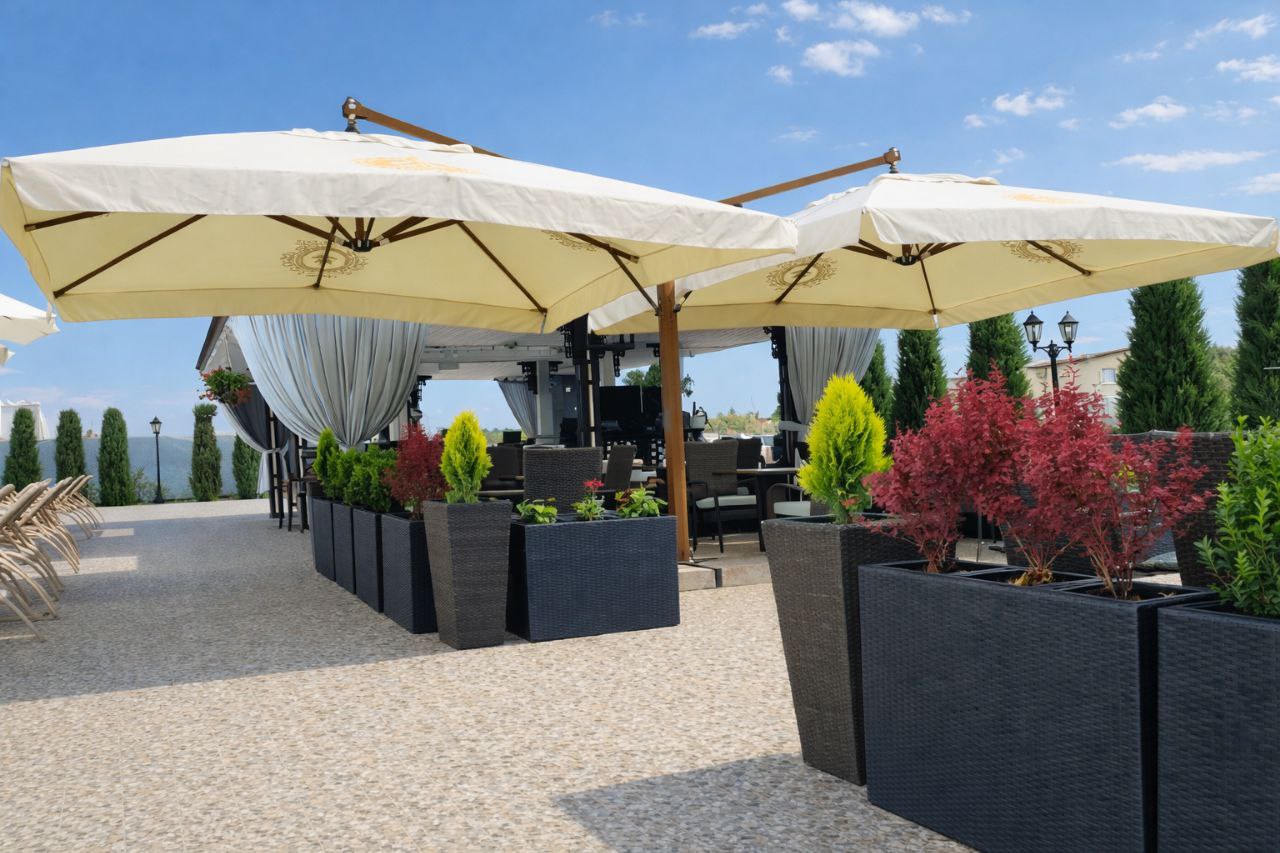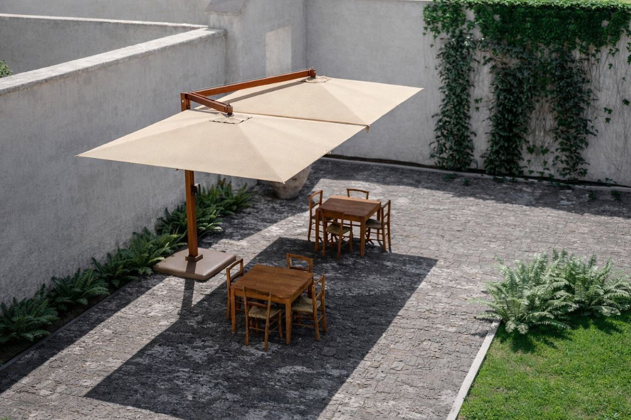 Bez parasoli ulicznych tego typu trudno wyobrazić sobie letnią strefę nowoczesnej kawiarni lub restauracji. W razie potrzeby taki parasol można łatwo wyposażyć w oświetlenie do obsługi letniej strefy restauracyjnej w godzinach wieczornych i nocnych. Charakterystyka: parasol z tej grupy jest przeznaczony na tarasy, na podesty letnie. Kształt kopuły kwadratowy, opcja montażu: na podłodze, typ stojaka parasolowego – boczny, mechanizm otwierania kopuły półautomatyczny. Podstawa parasola stojak krzyżowy. Liczba drutów kopuły -8 (szt.), liczba kopuł w projekcie – 2 (szt.). Kolor – NATURALNY. Okres gwarancji 36 (miesięcy). Słup parasola – metal pokryty farbą pod teksturę drewna w folii termokurczliwej. Elementy metalowe pokryte farbą, druty aluminiowe. Baldachim parasola wykonany z poliestru. Waga parasola wynosi 360kg. Wykończenie: Klapa przeciwwiatrowa, kąt nachylenia kopuły parasola jest regulowany.