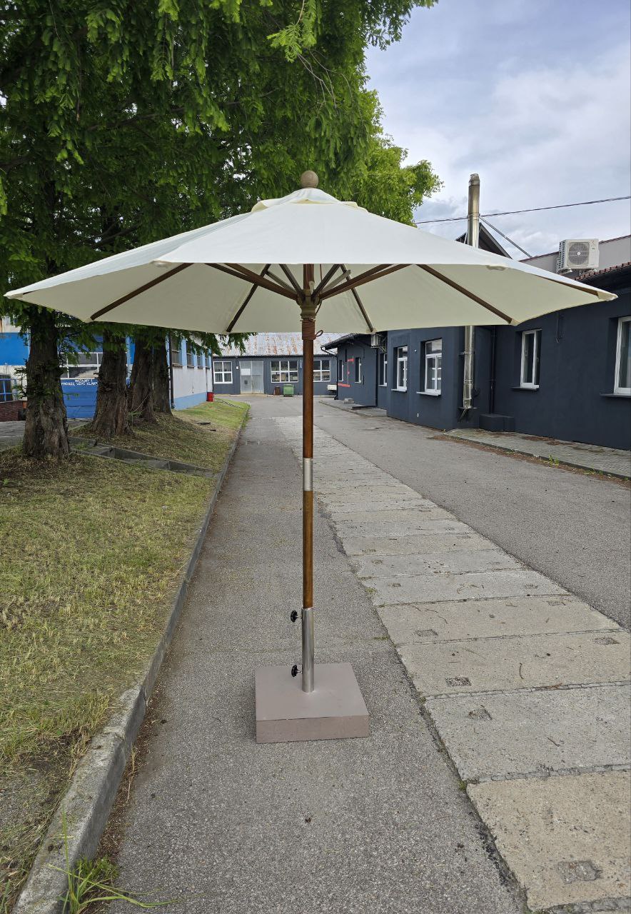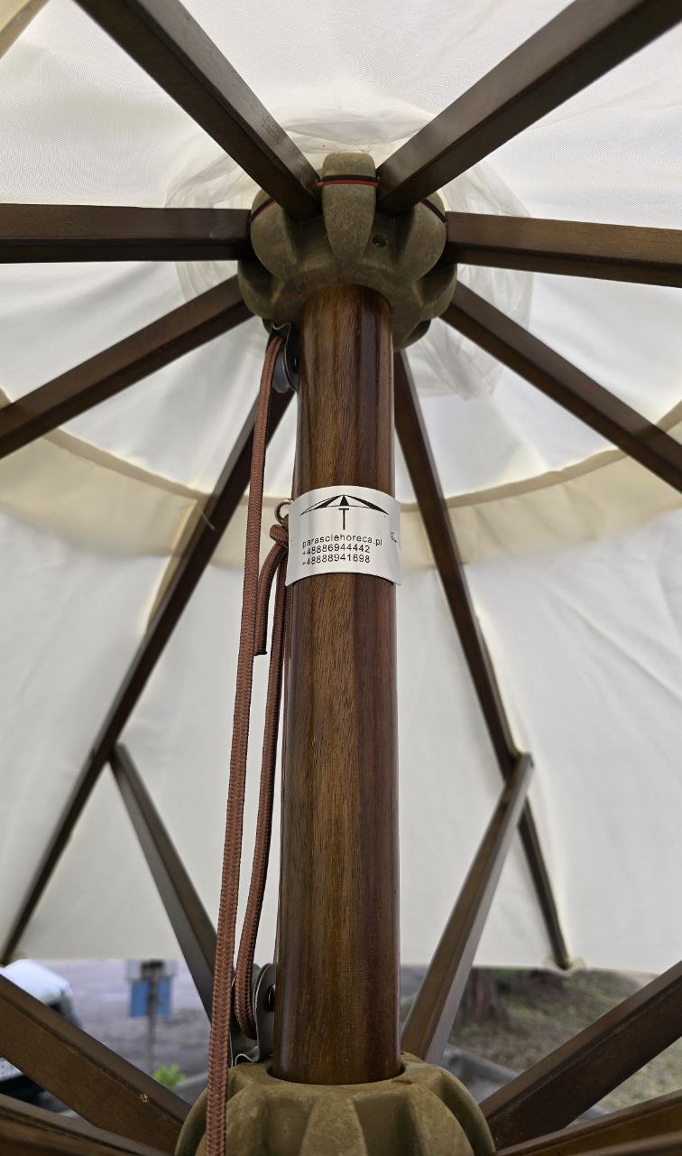 Parasol zewnętrzny Palladium Średnica kopuły: 2,5m (z klapą przeciwwiatrową), Druty: drewniane, 8 szt. Średnica środkowego słupka: 48 mm. Materiał: TWARDE DREWNO (drewno odporne na wilgoć). Tkanina: Poliester 235g/m2. Kolor tkaniny: NATURALNY (odporny na słońce i wodę).