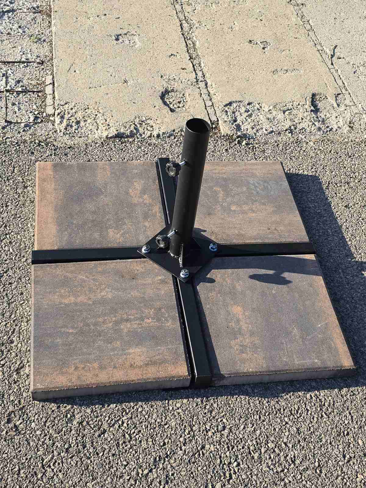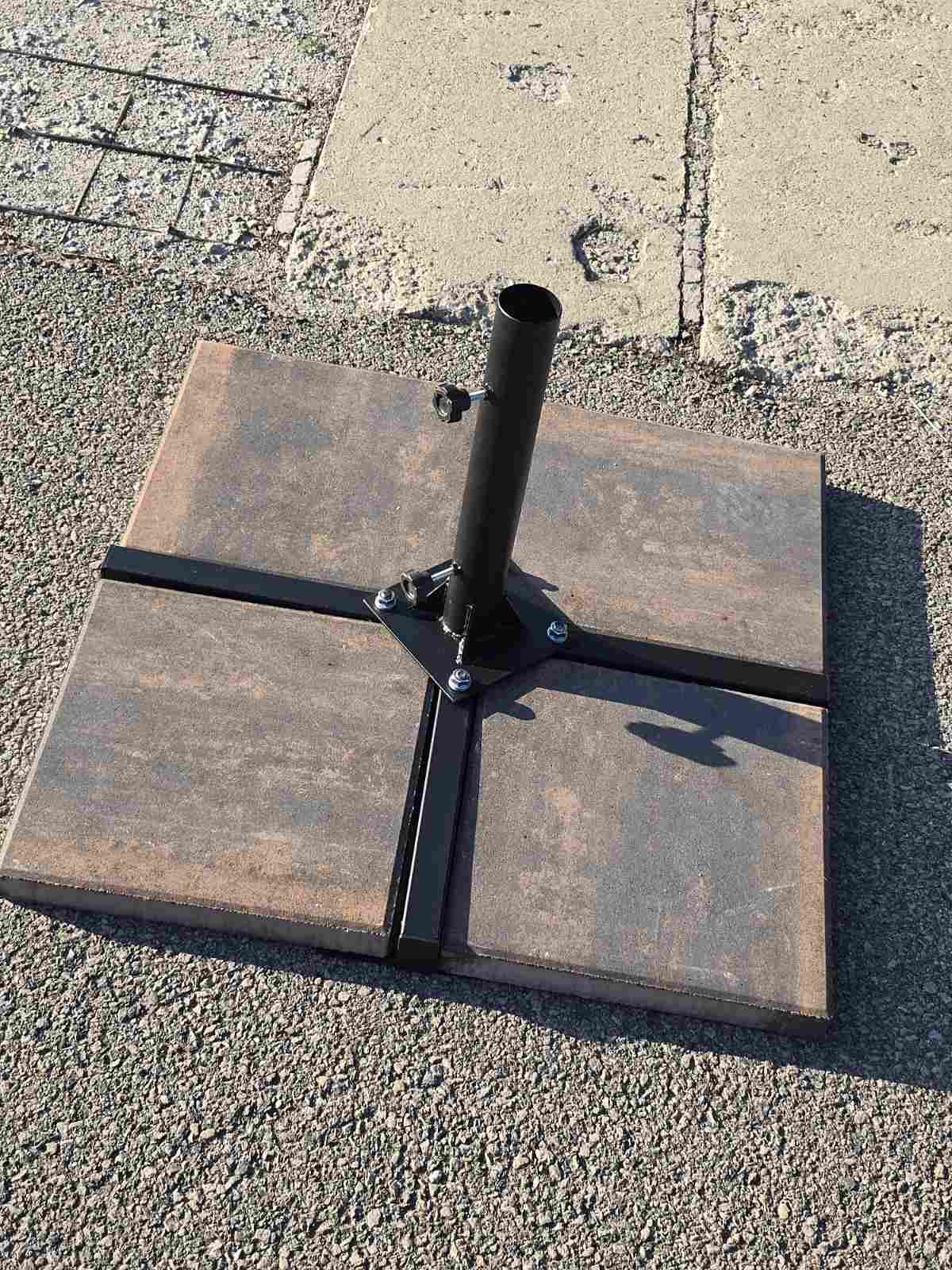 Stojak TN 80 do parasoli Solo,Praha,Genoa,Viena oraz do parasoli z centralnym słupem do 58 mm.Podstawa jest zrobiona w kształcie krzyża ze stali czarnej,material pokryty środkiem antykorozyjnym oraz czarną farbą proszkową.Masa całkowita wraz z płytami betonowymi o wymiarach 40x40x5 wynosi 80kg.Wymiary całkowite 89×89 cm.